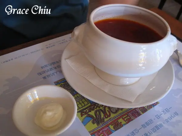 羅宋湯(套餐湯更換+160元)~比較特別的是湯裡有加了甜菜根熬煮所以湯色看起來更加紅通通,喝起來味道清爽,加上附上的酸奶味道會更柔和一些.