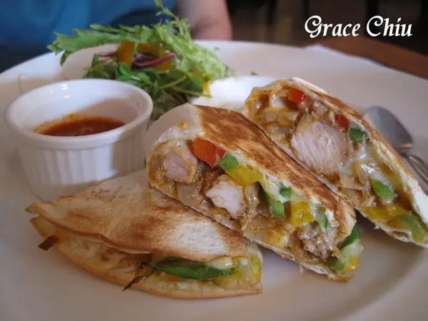 爐烤沙俄瑪雞肉起司薄餅~桿的薄薄的餅皮經高溫爐烤後香酥中又帶點軟Q口感,夾在薄餅裡的雞肉嫩口,餡料還包含甜椒.青椒.起司,吃起來在味道上還蠻像披薩的.