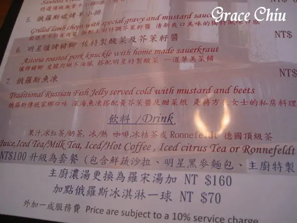 明星咖啡館單點餐點價格約380元起至上千元不等(有附飲品),加100元可升級套餐(鮮蔬沙拉.濃湯.明星黑麥麵包.甜點),平日中午也有推出較平價的商業午餐,這次我們選的三份餐點為~俄羅斯魚凍(480元) 爐烤沙俄瑪雞肉起司薄餅(380元) 俄式香料烤雞腿排(380元),都有另外再加價100元升級套餐,其中也將一份主廚濃湯更換為羅宋湯(+160元)