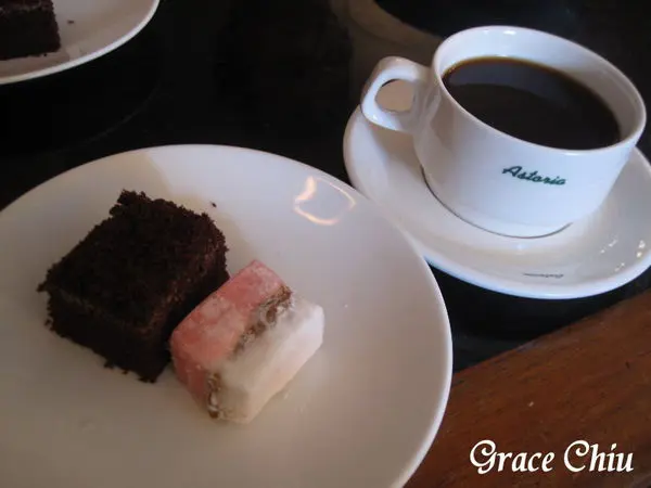 餐後飲品及甜點~飲品我們點了果汁.熱咖啡以及冰咖啡,熱咖啡直接喝蠻香醇的,冰咖啡喝起來酸度偏高,加了奶油球後才感覺比較順口一些,當日的飯後甜點附上的是一小塊巧克力蛋糕以及店內招牌"俄羅斯軟糖".