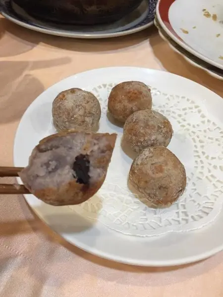 最後這道香酥芋泥球(一顆30元)是甜點,這道超超超超超級好吃,裡面有包紅豆,小編超愛吃芋泥球,可是這個跟別家的很不一樣,芋頭吃起來不會有硬硬乾乾的感覺,而是剛炸好,又軟又香。這道似乎是店家推薦的必點甜點,我們吃到一半老闆娘還有來問我們有沒有記得點芋泥球呢!
