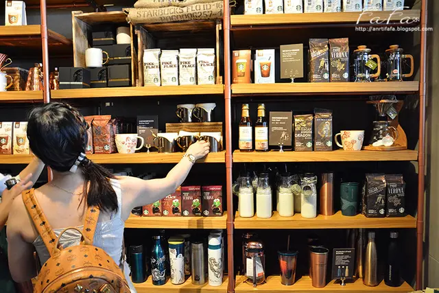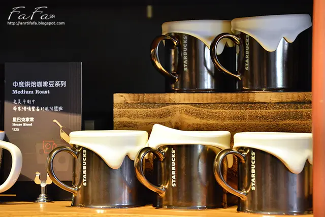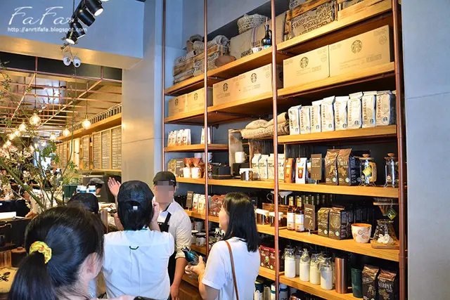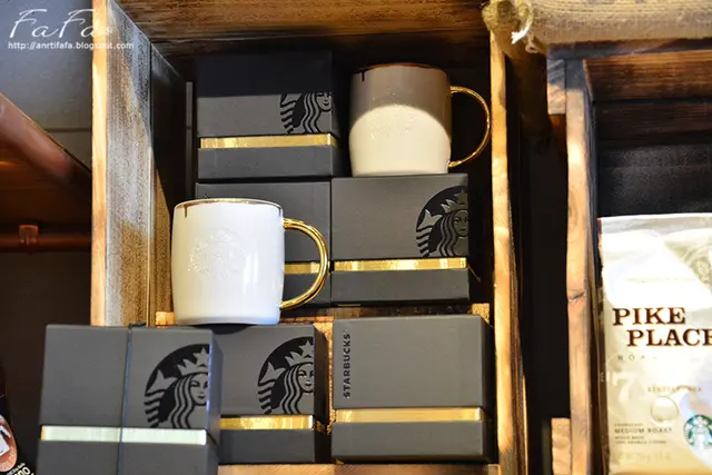 展示桌上有紅銅細口壺 NT$5500、橄欖木濾壓壺 NT$3600、Reserve 典藏儲存罐 NT$1380典藏工藝手沖咖啡禮盒搭配 12 oz &星巴克典藏馬克杯 NT$8800因為排隊人潮太多,也有不少人決定只買周邊商品而到後頭的櫃台結帳,