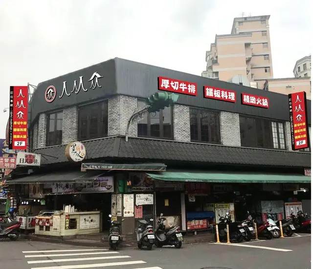 人从众厚切牛排景美店位於景美夜市商圈,離捷運景美站走路約3分鐘,位處二樓的位置,在路口就可以見到大招牌。走進商店街後就可以見到電梯及樓梯。至於店名的唸法,其實就是中國文字的學問,一個人,兩個人跟從,三個人聚集,所以就是唸<人從眾>,很有意思吧!