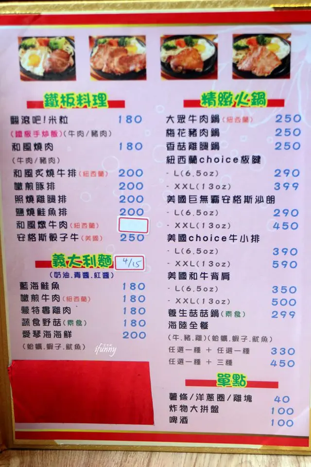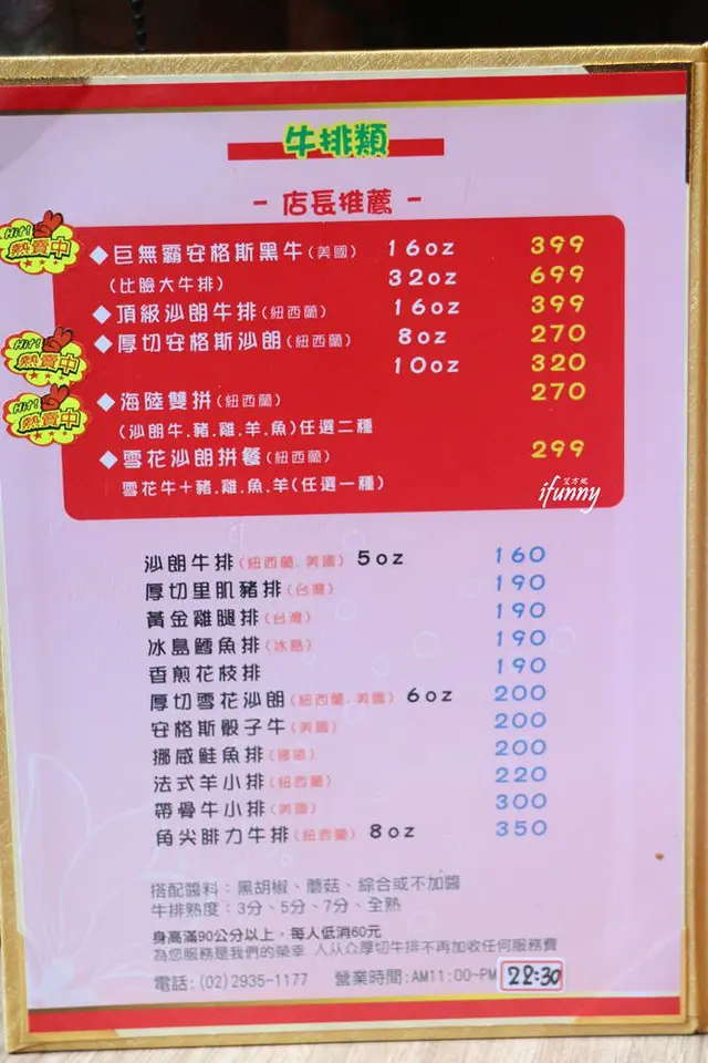 人从众厚切牛排景美店的菜單,這一頁是牛排區。最便宜$160就可以吃到了,價格真是親民。而我們這天就是為了那個比臉大牛排而來的。