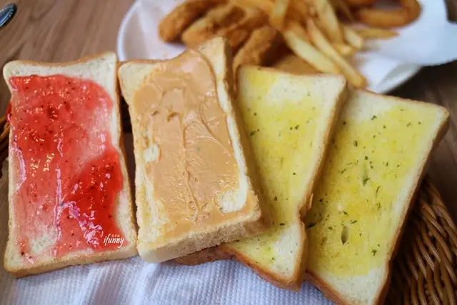 因為艾方妮喜歡酥脆的口感,於是都會讓吐司片烤過兩次。蒜味吐司經烤過後,奶油只留蒜味不油膩,蒜味香氣也很足。另外草莓醬及花生醬品質也不錯,因此吃來香甜酥脆。