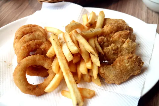 大概是因為進到人从众厚切牛排景美店的店內後,整個香氣逼得我們有點失去理智,竟然還多點了這個炸物拼盤。不過有見到這盤炸物很清爽嗎?油瀝得很乾淨,雞塊、薯條及洋蔥圈都不錯喔!