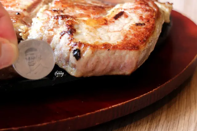 其實這是兩片16oz的牛排所組成的,有沒有覺得下面的煎蛋,變成很小?還有左下那個十元硬幣都小到快看不見了啦!