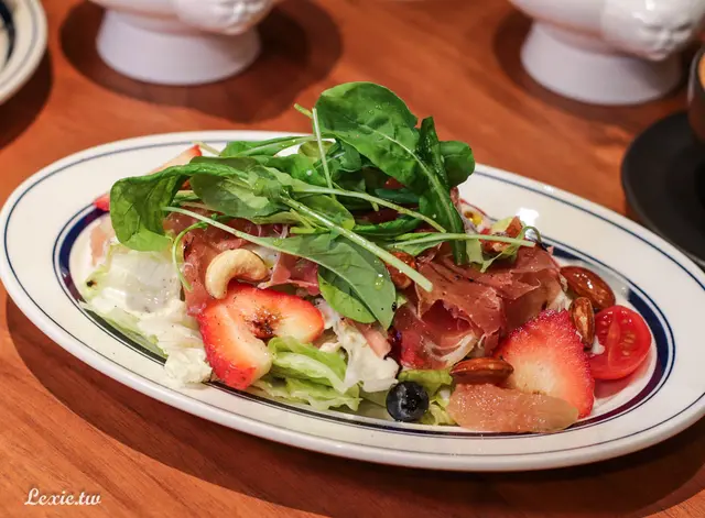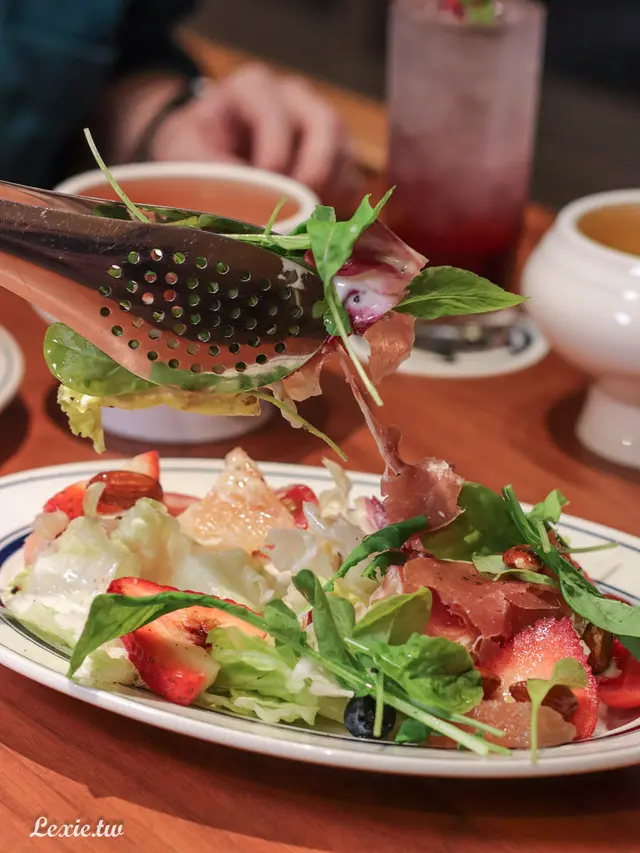 各種生菜搭上鹹香的沙拉醬,為這個夜晚開啟一個美好的序章。盤中的亮點是豪邁的幾片生火腿,鹹度較高配著爽脆的生菜一起吃,層次豐富。紅果實除了小番茄外還有草莓,額外點綴的脆口堅果會在咬到時散發陣陣香味,竟然還有幾塊葡萄柚。