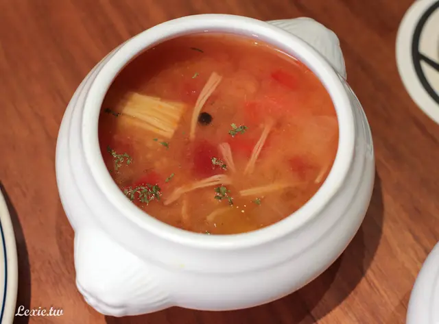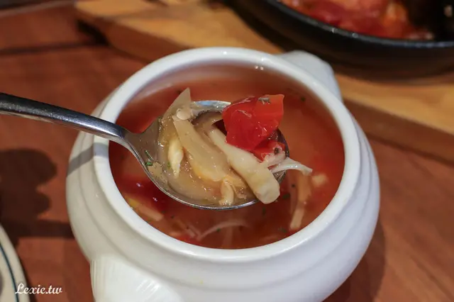 義式蕃茄湯令我印象比較深刻,裡面的胡蘿蔔燉到透,喝的到每一種蔬菜的香氣與甜味,湯喝起來是很清爽且偏酸的。