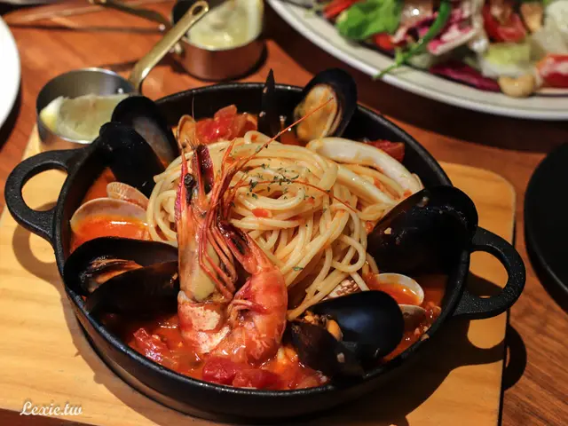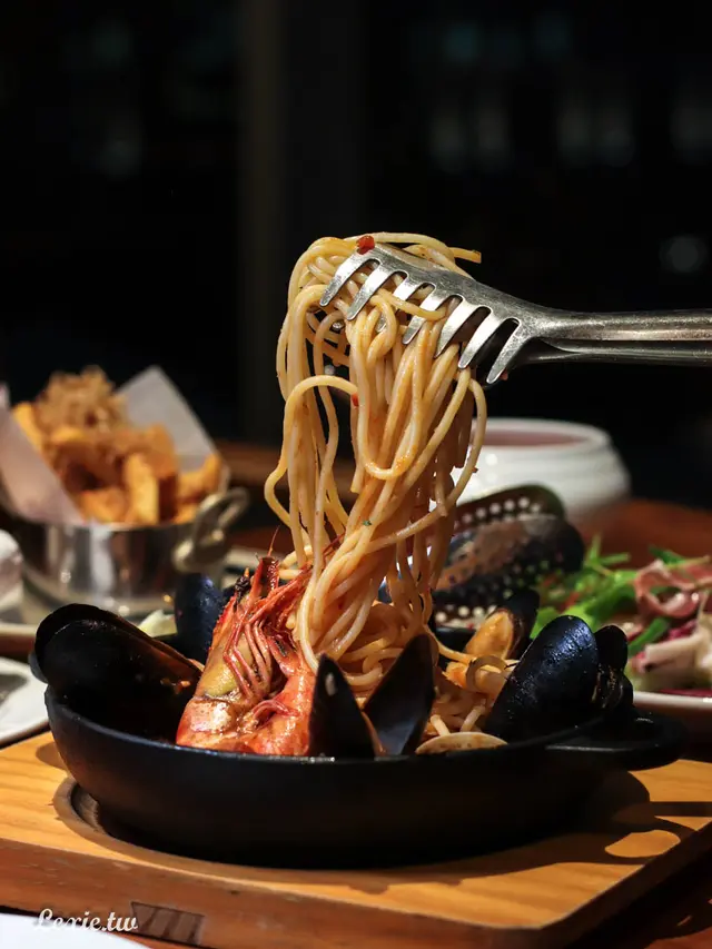 配料十分澎派的義大利麵,有蝦子/小卷/淡菜/蛤蠣,麵體本身還不錯,不那種千篇一律罐頭死板的蕃茄味,蕃茄的天然酸香氣很足夠,湯汁中又有煮出海鮮的鮮味,下面的湯汁與番茄較鹹、口味偏重。但湯汁較水,所以扒著麵的程度就差了一些。