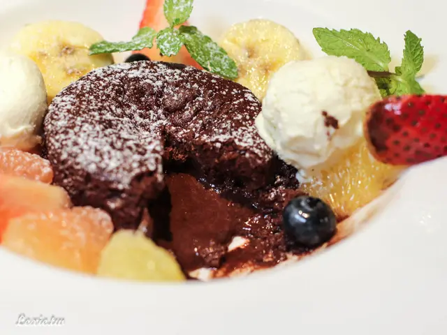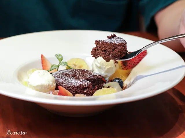 中間的日式生巧克力蛋糕很類似熔岩巧克力蛋糕,口感外面比較紮實,中心切開還是會流漿的質地,帶著一點苦甜的巧克力沾著水果與冰淇淋一起吃,周圍還有再搭上三四種的水果,水果酸甜度讓巧克力蛋糕變的不甜膩,整體口感很豐富。