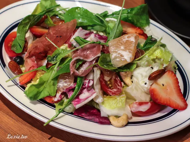 我常常覺得沙拉看起來簡單但其實是困難的菜色,不是製作上困難而是搭配上的困難,很容易覺得千篇一律、無趣。但這盤沙拉是從頭吃到尾都很精彩的一款,口感口味與色彩都搭配的十分出色。
