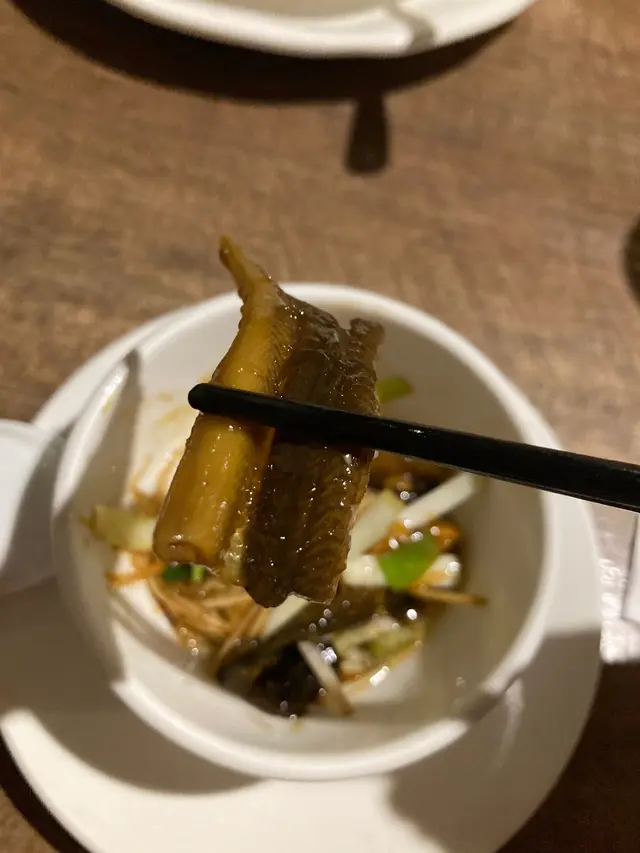 有點類似片皮鴨,醬汁和肉(還有韭菜)