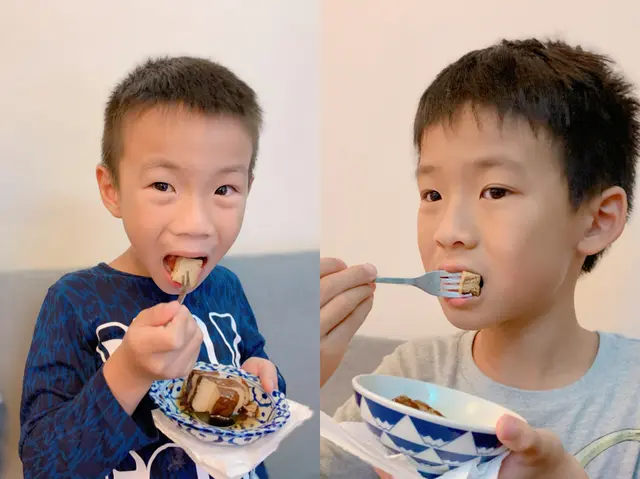 本來想說這兩個應該不會賞臉,沒想到一整個超愛有幸福的豆干,一人我各切二塊給他們馬上吃光光