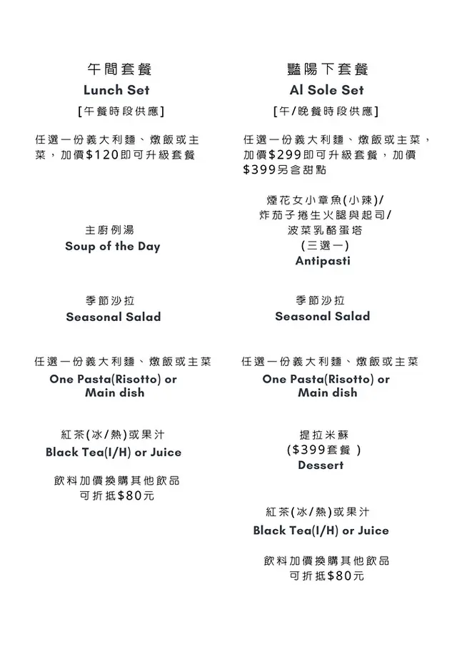 豔陽下套餐(午/晚餐提供)任選一款義大利麵/燉飯/主餐+299元升級為套餐,+399元另加甜點