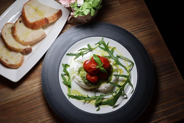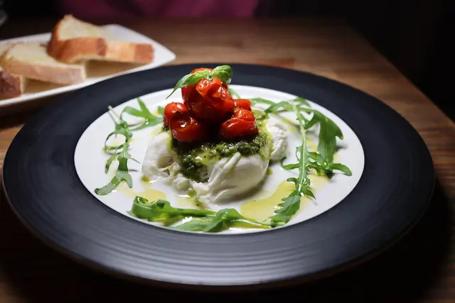 我們的卡布里沙拉(蛋奶素):水牛布拉塔起司,羅勒松子青醬,慢烤蕃茄,特級初榨橄欖油