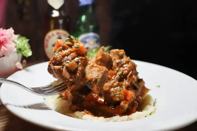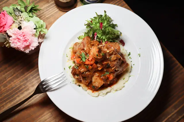 小牛膝上裹上濃郁的醬料,搭配上綿密的馬鈴薯泥!吃起來真的會有飽足感喔!
