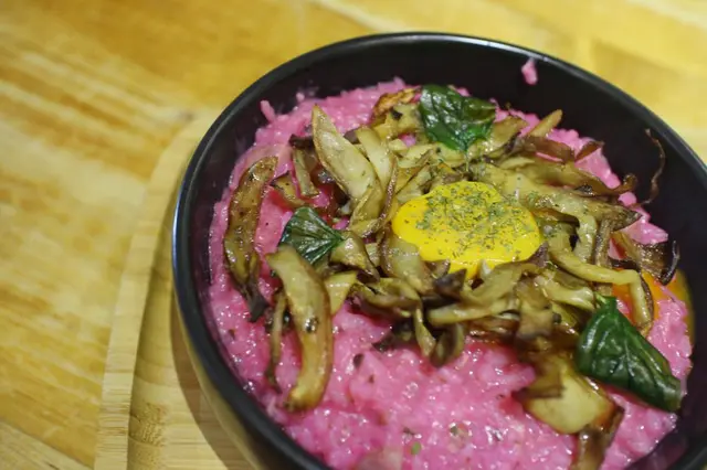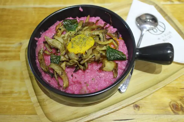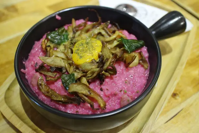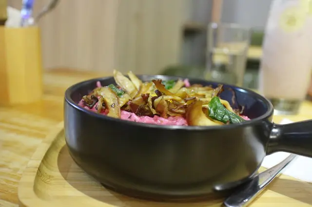 以香腸和菇類為主,粉紅色燉飯來自於甜菜根的顏色,讓燉飯呈現很亮麗的色澤,燉飯的米飯是偏軟的口感,味道算重,也算是飽足感算很高的一道