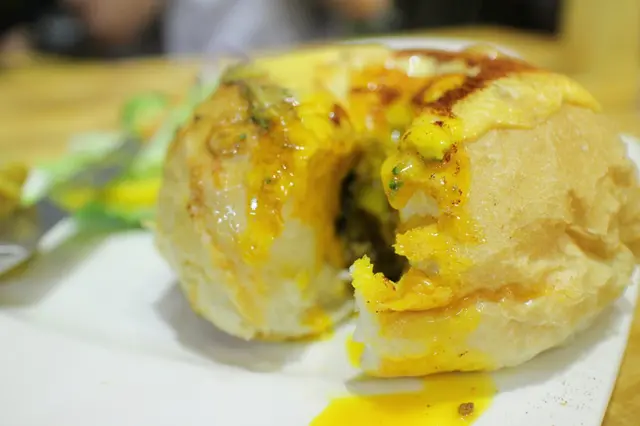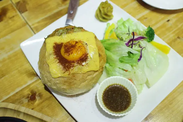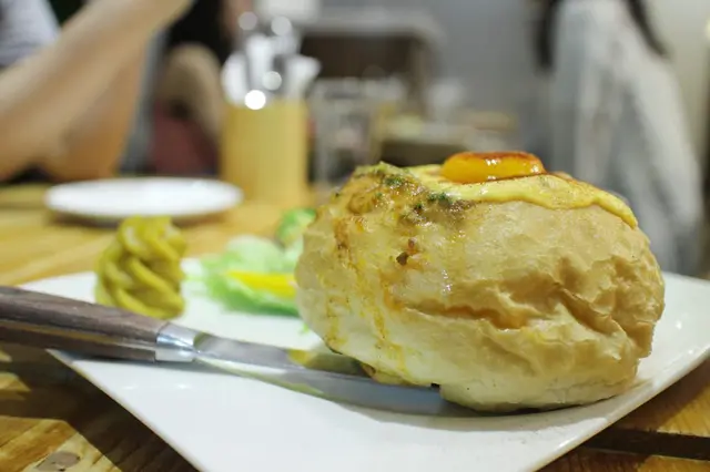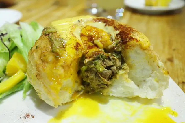 切開後半熟的起司片和生蛋黃,汩汩流出,麵包裡的牛肉份量很多,這道我覺得適合兩個人一起合點,一個人很難吃完呢