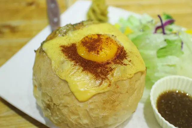 和記憶果汁相同是店內人氣招牌。老闆結合過去在燒烤店的醃肉經驗,將牛肉和洋蔥加上黃芥末可以提味之外,還可以讓肉質更為鬆軟,將炒好的牛肉放入麵包,再蓋上起司片和生蛋黃,放入烤箱烤出迷人的香氣