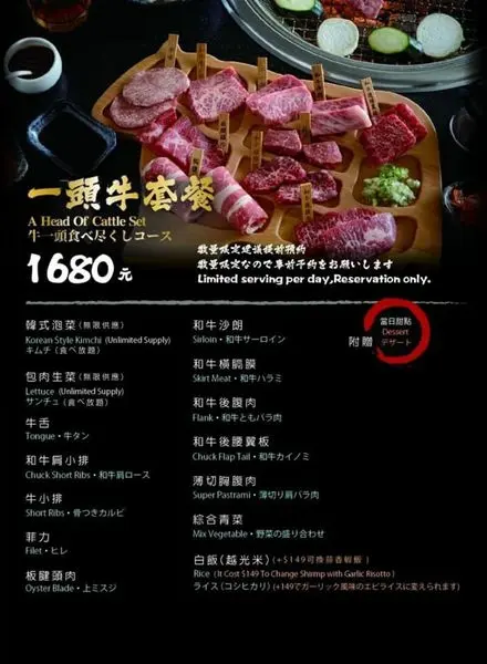 【京東燒肉專門店】菜單以套餐為主,另外也有單點,一頭牛套餐還附甜點只要$1680,整個好划算