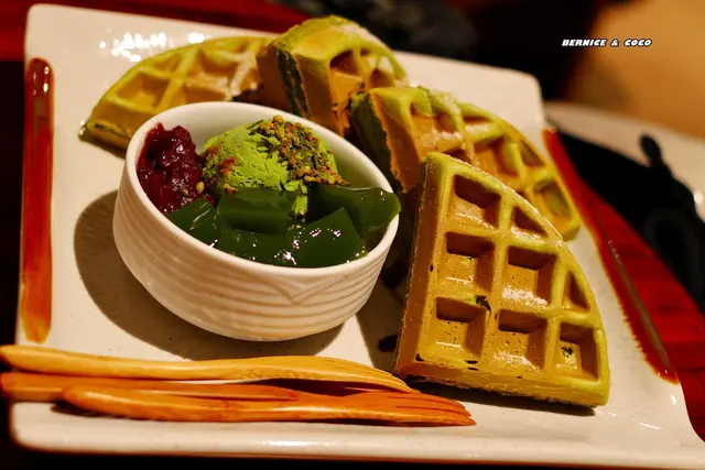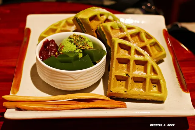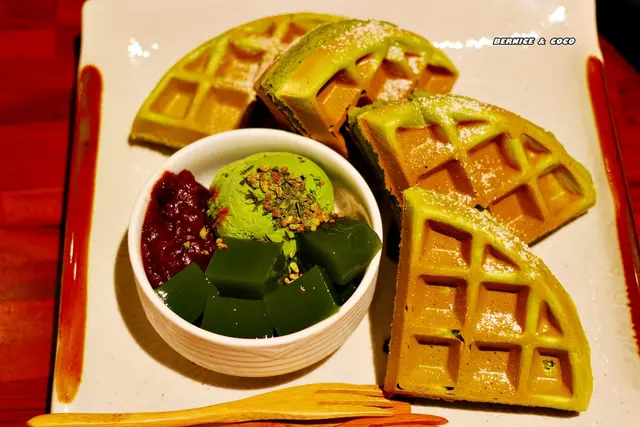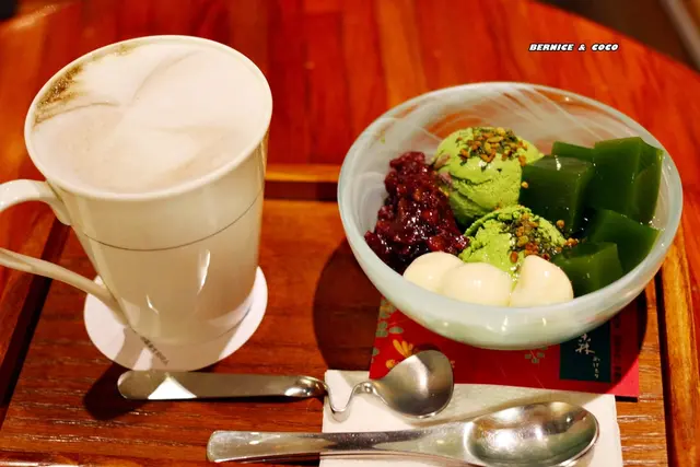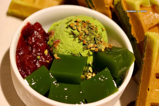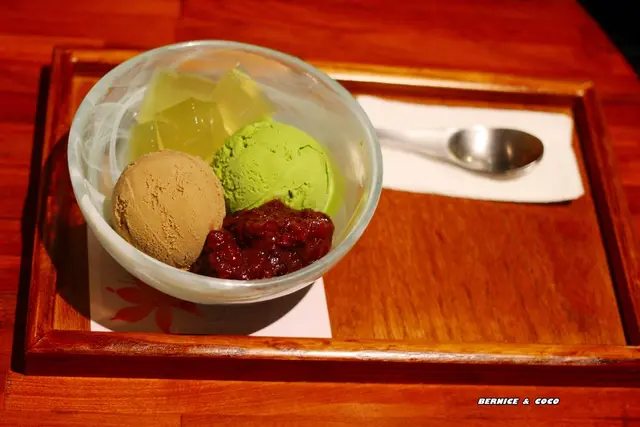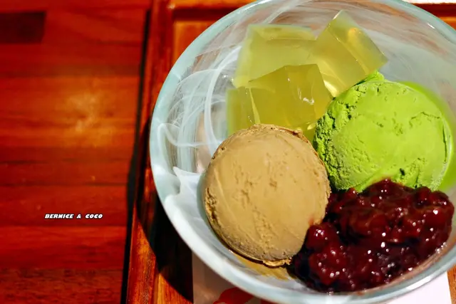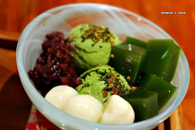 甜點碗裡裝的是一球冰淇淋 抹茶凍和紅豆泥