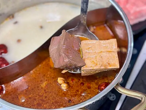 ▼麻辣鍋底內含軟嫩的鴨血、豆腐。