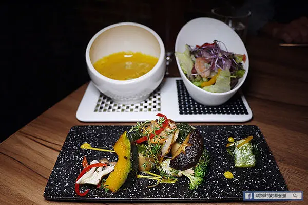 梵谷夜沐精緻套餐,凡點主餐加上388元,就有碳烤小捲北非小米歐式沙拉、培根杏鮑菇岩扇貝佐冷壓青醬和每日例湯。