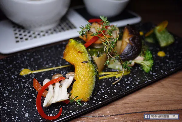 培根杏鮑菇岩扇貝佐冷壓青醬,這些蔬食皆以烤的方式呈現,烤後的食材帶有香氣,而且鎖住水份,清爽無負擔。