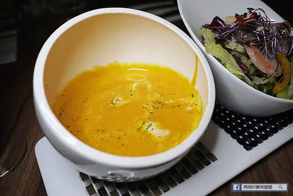 每日例湯是海鮮南瓜湯,裡面有一些鮮蝦等海鮮食材,加上用新鮮南瓜熬煮,味道香甜有帶有海鮮鮮味,和一般喝到的純南瓜濃湯不一樣,多了鮮味的層次感。
