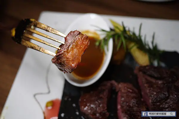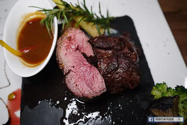菲力牛沾上以紅酒為基底的甜蔥酒汁帶有酒香和洋蔥的甜味,比起單吃可說是甜上加甜,另外若有需要也可以沾玫瑰鹽或胡椒,但我個人覺得單吃是最能吃出牛肉的風味。