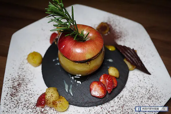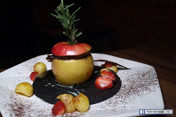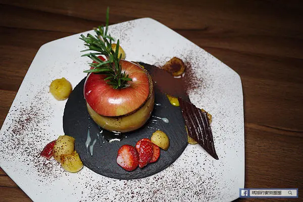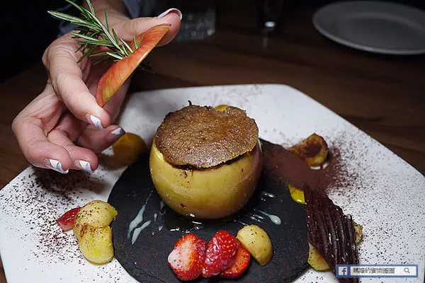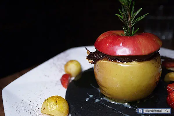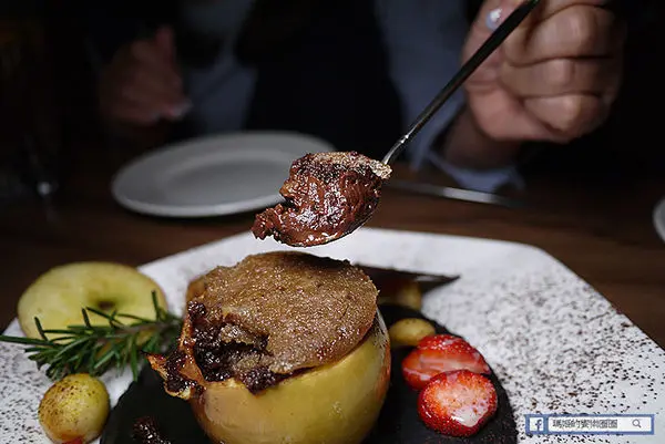 蘋果熱熔巧克力,主廚把蘋果中心挖空再填入熔岩巧克力蛋糕的組織,旁邊又有新鮮草莓和蘋果果肉可和熔岩巧克力蛋糕一起吃。