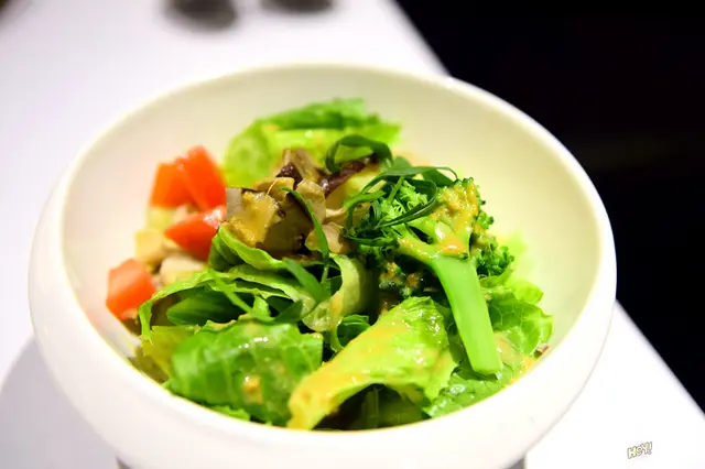 沙拉小小一碗,不大,裡面有番茄、野菇、生菜、花椰菜、芝麻葉