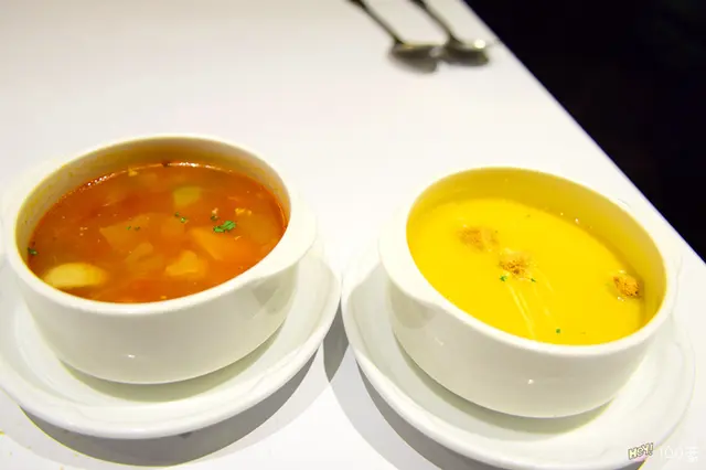 湯品左為番茄蔬菜湯,右為南瓜濃湯