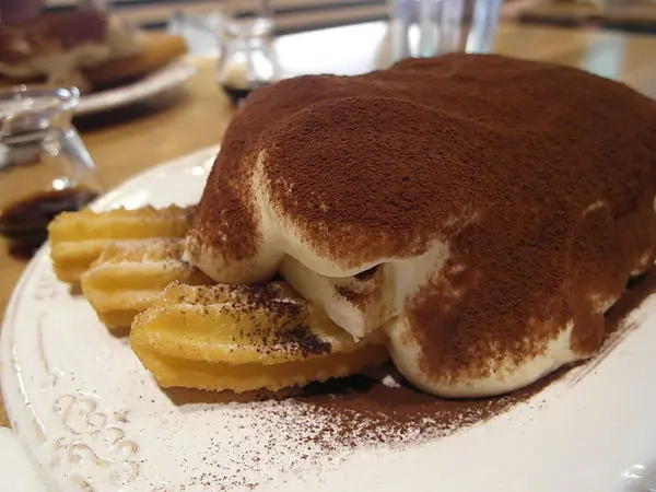 上面的奶油非常非常多,撒上滿滿的可可粉,奶油跟啾拿棒中間還有香蕉