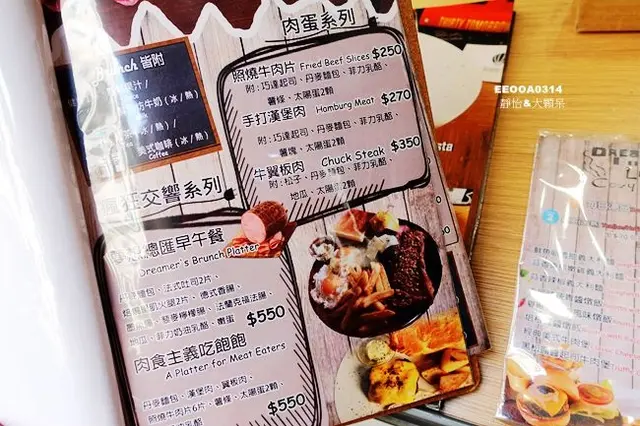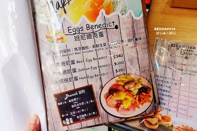 Dreamer 38早午餐菜單:有班尼迪克蛋、瘋狂交響系列、肉蛋系列及自選系列,早午餐皆附兩杯飲品:一杯健康的新鮮果汁或牛奶,一杯紅茶或英式咖啡,飲料也可以加價更換成喜歡的飲品