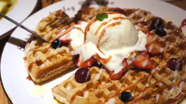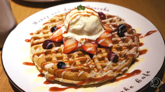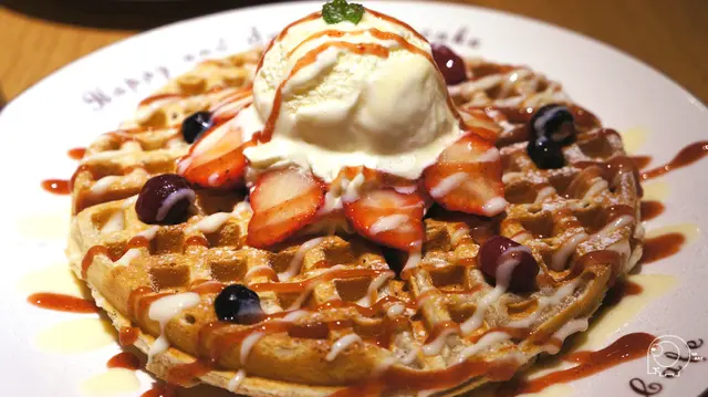 鬆餅上面有淋上卡士達醬跟草莓醬