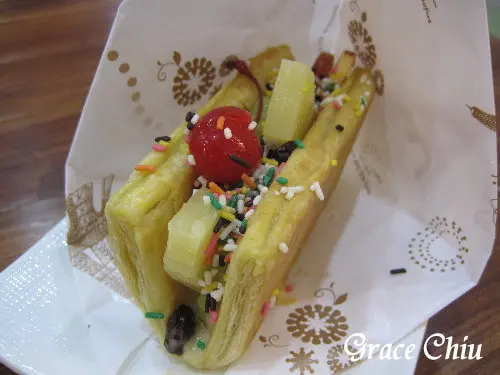 果香脆派堡,外層是厚厚的酥派皮,裡頭加的水果有薄切片蘋果.奇異果.罐頭鳯梨片.最上頭有顆罐頭櫻桃,其中還加了一些葡萄乾跟灑了些彩色巧克力米,酥皮的層層堆疊厚實口感還不錯,整體滋味清爽,雖不算很特別,但在夏天偶爾吃一份這樣的輕食也還可以啦.