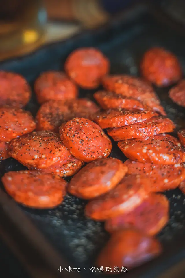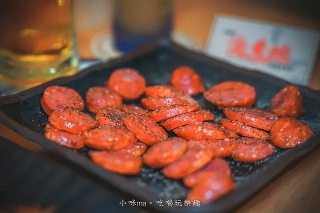 香腸裡面滿滿的飛魚卵,吃起來啵滋啵滋的口感太誘人了,上面撒上點黑胡椒提味,皮還烤到恰恰,這道必點啊~多麼下酒啊!