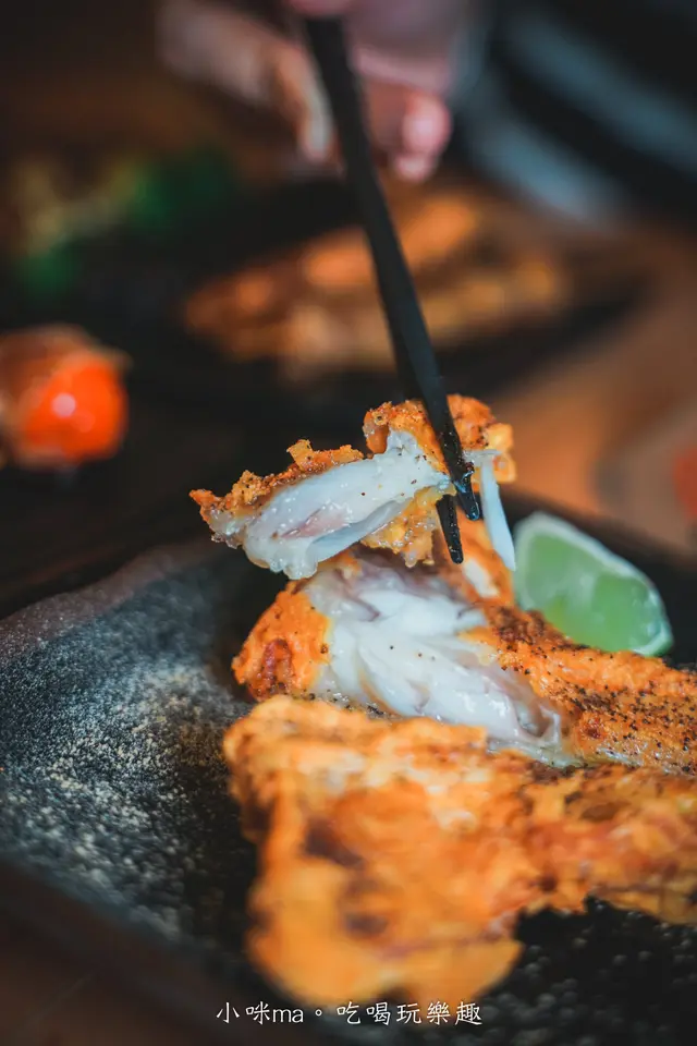 大推鯛魚下巴,別以為它們只有串燒,炸到酥脆的魚皮吃起來有夠脆,拿著直接啃真的滿嘴香氣,一口咬下裡面的魚肉超級嫩,而且非常多汁,不是乾巴巴的那種,我覺得比一般烤的更涮嘴好吃