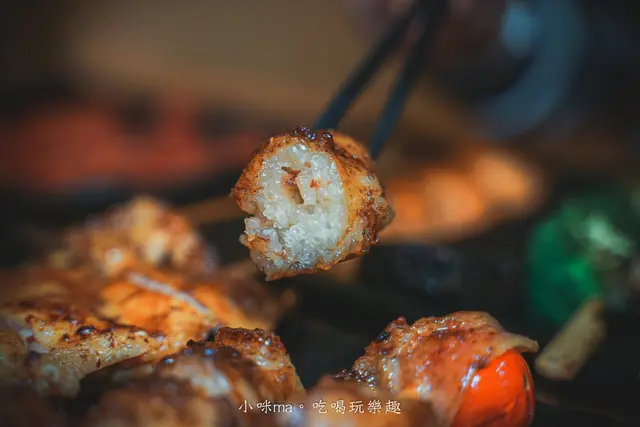 梅花肉串吃起來油脂豐富,肉質紮實有咬勁,很像韓果的烤豬五花耶,花枝丸彈牙帶有花枝香氣,一點醬香提味更香了