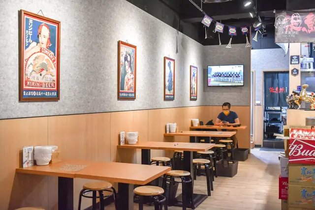 每桌底下都有置物籃可使用,牆面上還有架設電視。