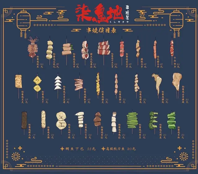 柒息地長春店的串燒有蔬菜、豬肉、牛肉及海鮮,價位落在$19~$85元之間。