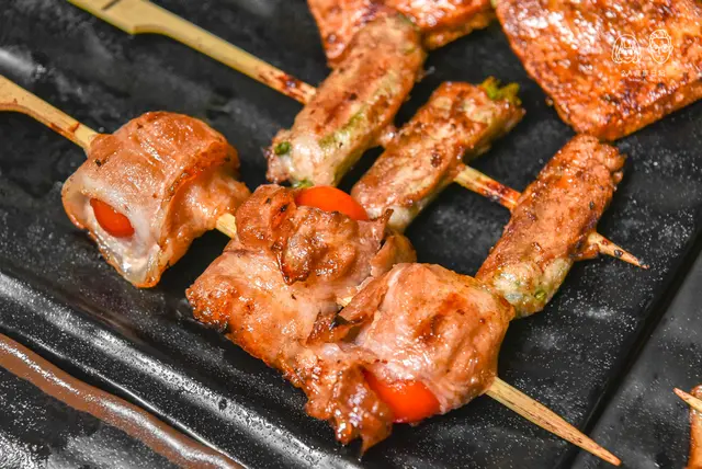 肉質扎實的豬五花包覆多汁的番茄有著豐富層次感,這樣的組合清爽又耐吃,搭配蔥段的肉串則吃得到青蔥脆脆的口感及香氣。