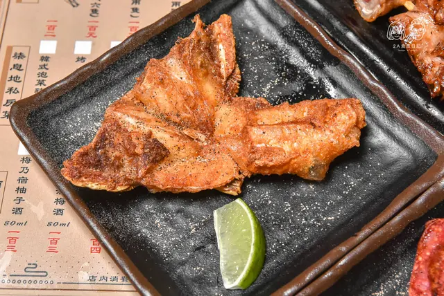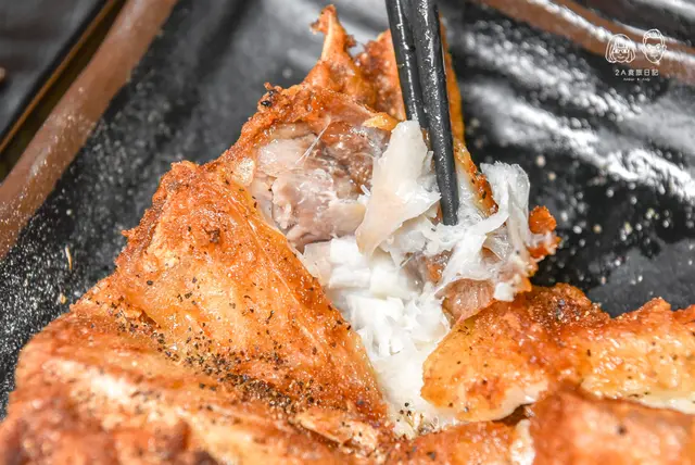 鯛魚下巴炸到金黃酥脆,看起來特別誘人!鯛魚吃起來外脆內細緻,沒有絲毫的魚腥味,讓害怕腥味的我也一直動筷~簡單搭配椒鹽就很不錯,擠上點檸檬的滋味更清爽。