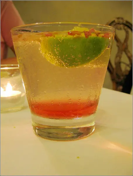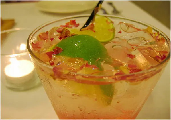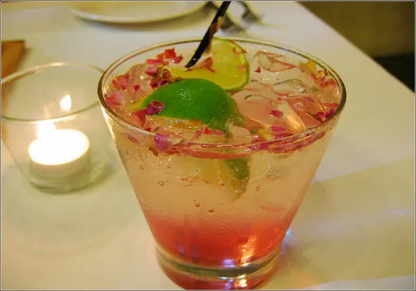中層透明的檸檬氣泡飲、搭配下層粉紅色的玫瑰糖漿