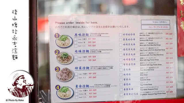 永吉涼麵店內主打的原味涼麵分成三種份量價格,分別是小份35元、中份45元與大份55元,一般點中份應該就可以吃很飽,另外永吉涼麵還有一個很有名的肉燥涼麵,這次沒有吃到,下次有機會也想來點點看,肉燥涼麵只有分小碗45元與大碗55元兩種價格,味噌湯就基本的貢丸、蛋花的組合,還多了紫菜湯,價格從20元到45元不等,永吉涼麵菜單還蠻厲害的,竟然有日文菜單,果然是日本人會來的涼麵店。