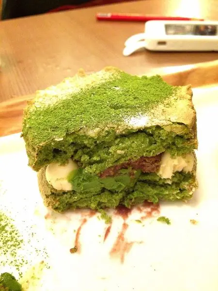 第一口吃下去的時候,蛋糕在嘴巴裡123456...總之超多層,每層中間夾著微苦的抹茶奶油,好吃!!