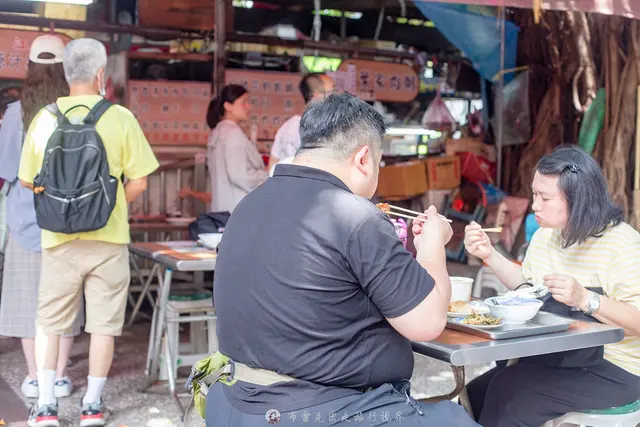 《江家原汁排骨湯》內用區不是只有攤前的吧台座位而已,都可以到後面的慈聖宮廟埕前,有一整排的桌子可以使用,很自然的戶外座位區,還好有大樹遮陽,要不然真的很曬,這邊的座位區每一排都是不同的攤位,但很方便的是你來吃《江家原汁排骨湯》,可以順便點旁邊的葉家肉粥的炸物當配菜。