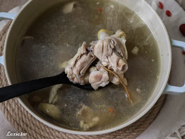雞湯湯底添加了紅棗、人蔘鬚、當歸、川芎、枸杞,使用天然的中藥材燉煮,熬出雞湯的精華,是一款居家必備的湯品。
